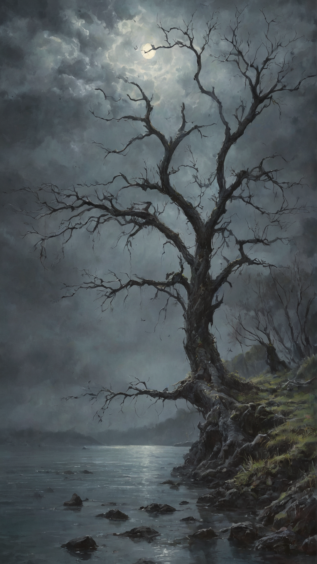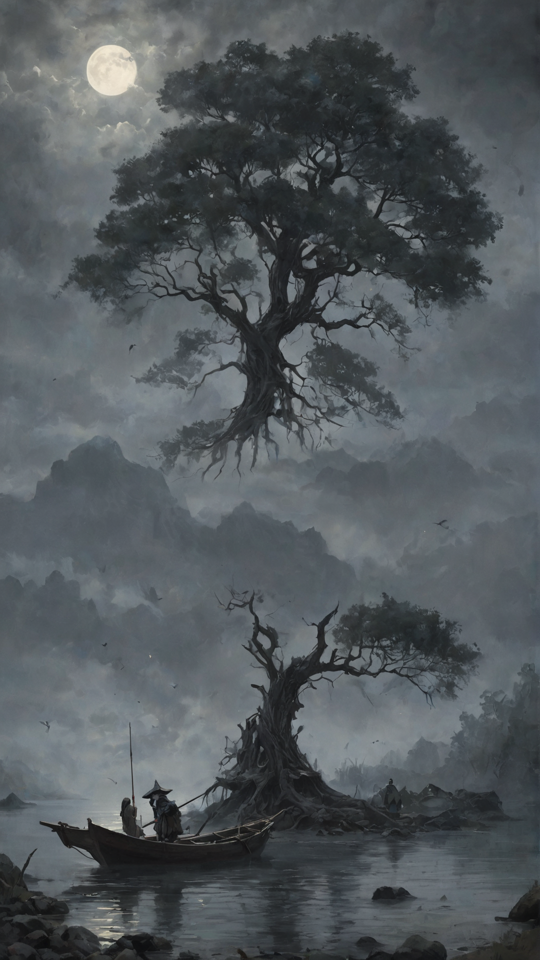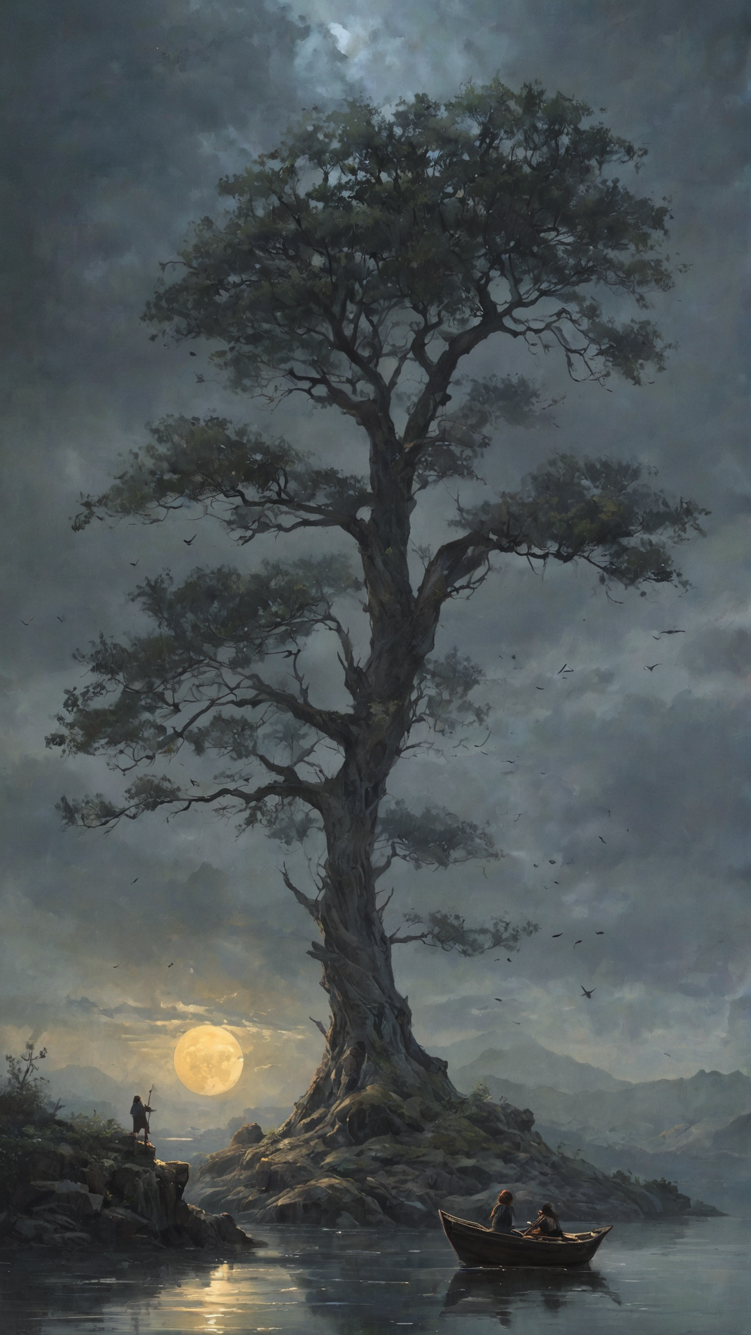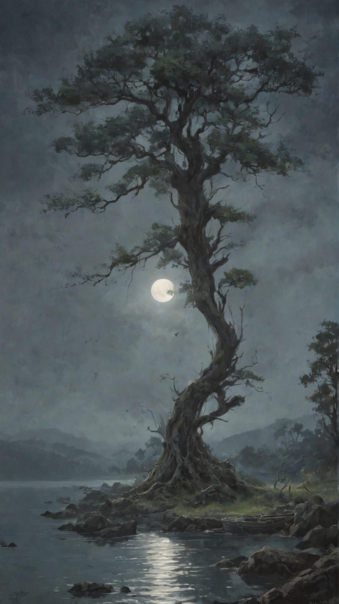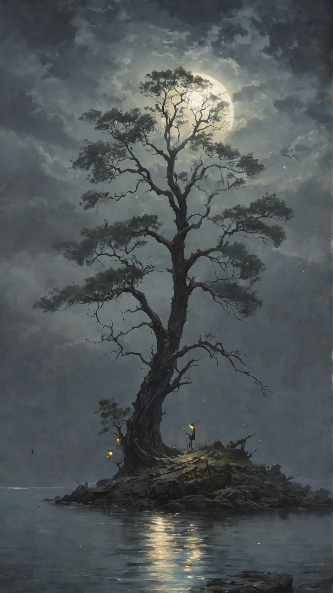 Under the pale light of the full moon, dark atmosphere, dark clouds and mist, a gorgeous tree looking at the viewer, in the background a fisherman island. romantic impressionism, dream scenery art, beautiful oil matte painting, romantic, beautiful digital painting, anime landscape, romantic painting, dreamlike digital painting, colorful painting, thick brushstrokes characteristic, rough stroke, beautiful gorgeous digital art, style Karol Bok, Brian Froud, Wendy Froud, Guy Davis, Sergio Sandoval
